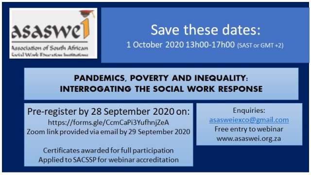 ASASWEI Webinar 1 October 2020 13h00-17h00-PANDEMICS, POVERTY AND INEQUALITY: INTERROGATING THE SOCIAL WORK RESPONSE Dear colleagues ASASWEI is delighted to bring to you a colloquium (mini-symposium) on PANDEMICS, POVERTY AND INEQUALITY: INTERROGATING THE SOCIAL WORK RESPONSE Click here to pre-register by 28 September 2020 on: https://forms.gle/CcmCaPi3YufhnjZeA. Zoom link provided via email by 29 September 2020. Certificates awarded…