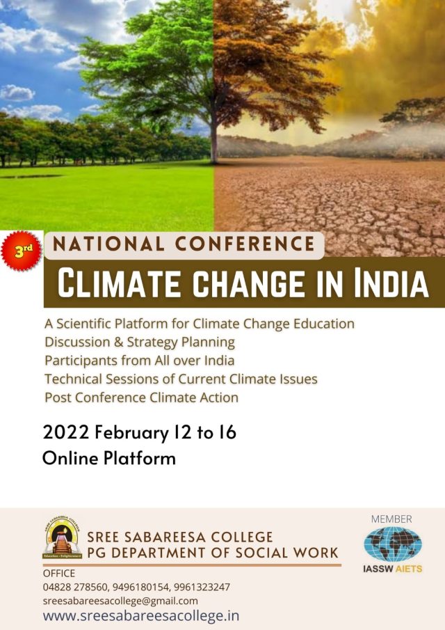 National Conference on Climate Change The PG Department of Social Work, Sree Sabareesa College is hosting its third national conference on climate change on February 12th to 16th, 2022 through online mode. It is a scientific platform for climate change education, discussion, and strategy planning. Technical sessions on climate change will be held each day. Join via https://docs.google.com/forms/d/e/1FAIpQLSewzwBKpyCmbez3XJLWYEpk4MaamaNJDCURurrtX15stDdnBg/viewform?usp=sf_link