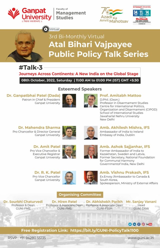 Invitation to Join 3rd Atal Bihari Vajpayee Public Policy Talk Series Dear Sir/ Madam, Greetings from Ganpat University- FMS !!!. We take immense pleasure to inform you that Ganpat University-Faculty of Management Studies is going to organize a 3rd Bi-Monthly Virtual Atal Bihari Vajpayee Public Policy Talk series on “Journeys Across Continents: A New India…
