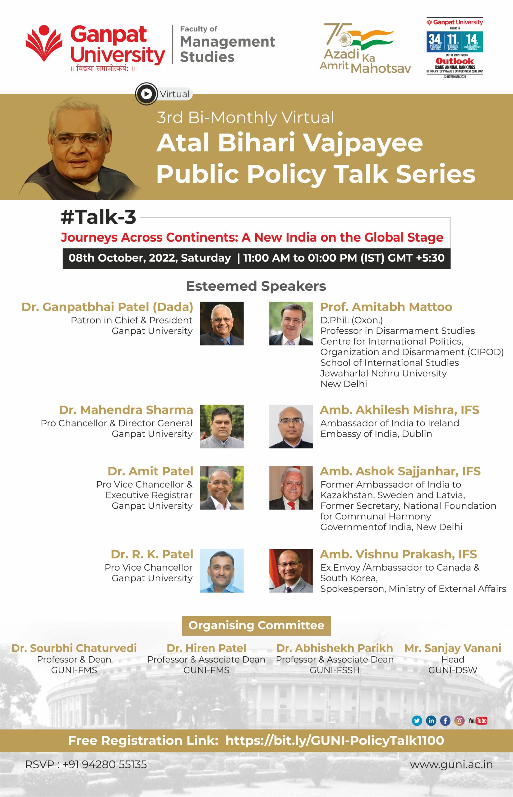 We take immense pleasure to inform you that Ganpat University-Faculty of Management Studies is going to organize a 3rd Bi-Monthly Virtual Atal Bihari Vajpayee Public Policy Talk series on “Journeys Across Continents: A New India on the Global Stage”. This is a multi-disciplinary, cross-cultural, extremely thoughtful elite talk series where we invite veteran bureaucrats, public leaders, policy makers, diplomates, academicians & change evangelists to share their views.