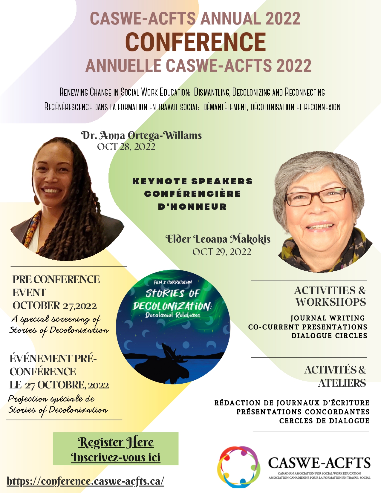 The Canadian Association for Social Work Education (CASWE-ACFTS) 2022 Annual Conference will be held on October 28 and 29.Join us for a two-day virtual experience and listen to two amazing presentations from our keynote speakers. Attendees will be able to take part in journal writing, co-current presentation, dialogue circles and a special movie screening of Stories of Decolonization: (De) Colonial Relations and a Q&A on October 27 from 6 p.m. to 8 p.m. ET.
