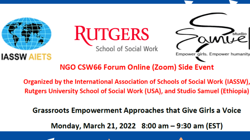 NGO CSW66 Forum Online (Zoom) Side Event Organized by the International Association of Schools of Social Work (IASSW), Rutgers University School of Social Work (USA), and Studio Samuel (Ethiopia) Grassroots Empowerment Approaches that Give Girls a Voice Monday, March 21, 2022 8:00 am – 9:30 am (EST) Integrating a curriculum in social work education on…